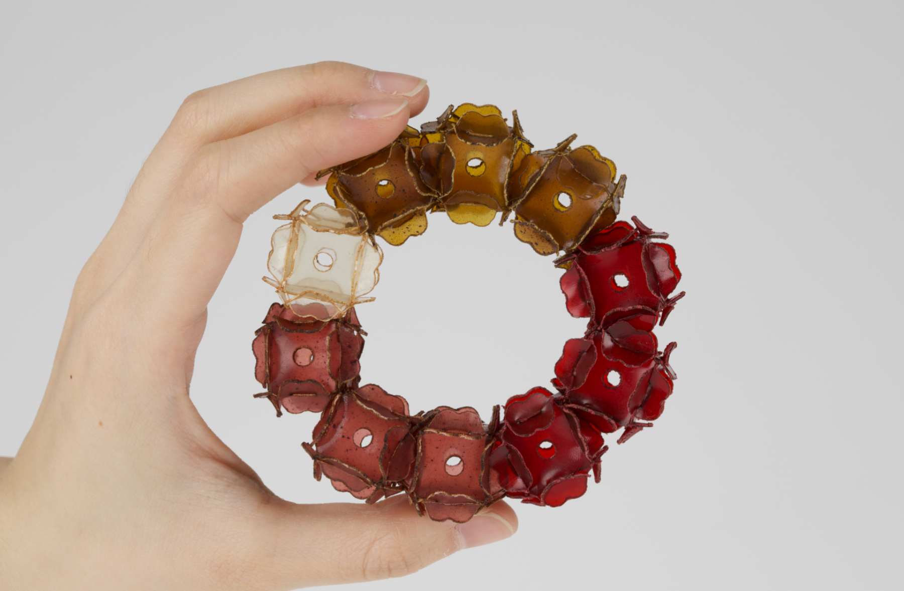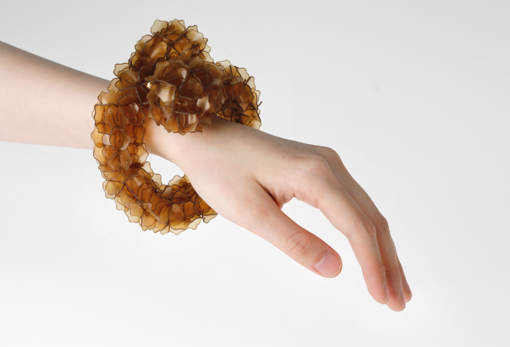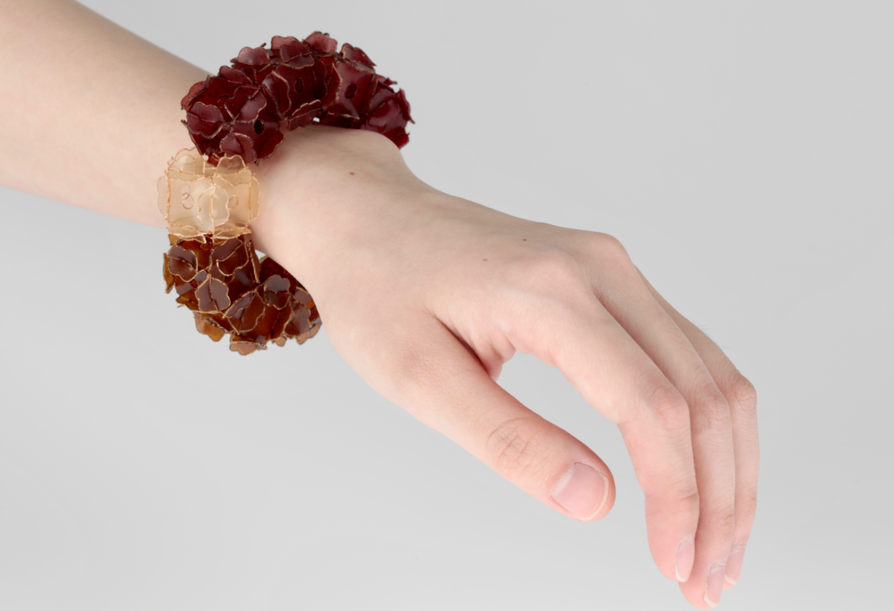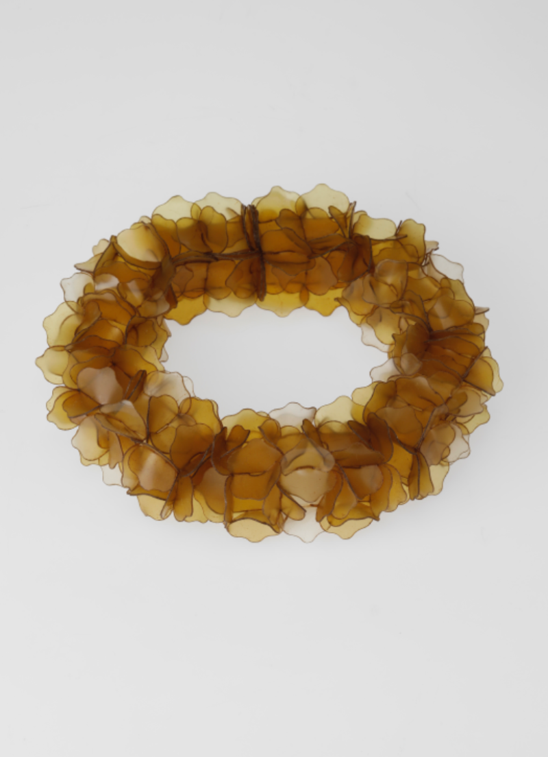 The project explores jewellery as a living extension of the marine cycle. Using fish scale bioplastic—a biodegradable material developed from discarded fish waste—I transform overlooked residue into poetic, wearable forms. Inspired by seaweed, plankton, and coral, the modular designs expand and flow across the body like organisms reclaiming space. Coloured with natural plant and fruit dyes, the pieces highlight the vibrancy and fragility of marine ecosystems. Designed to biodegrade, they invite reflection on impermanence and our relationship with adornment, offering an alternative narrative rooted in transformation, ecological responsibility, and the rhythms of the sea.