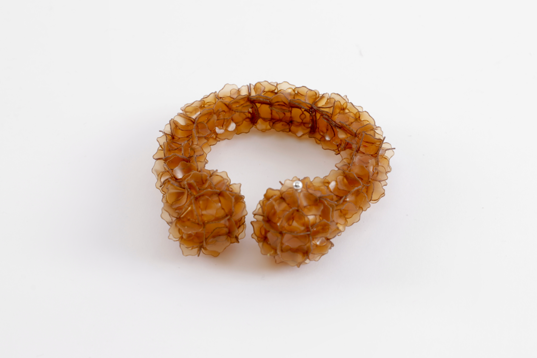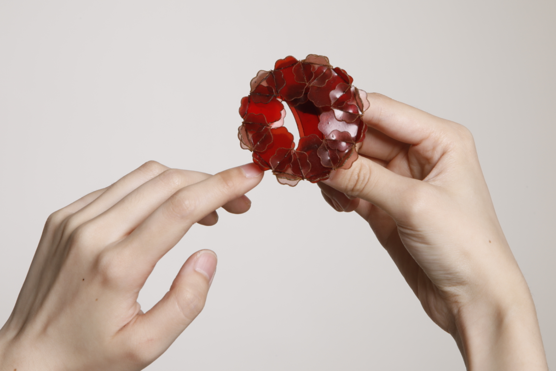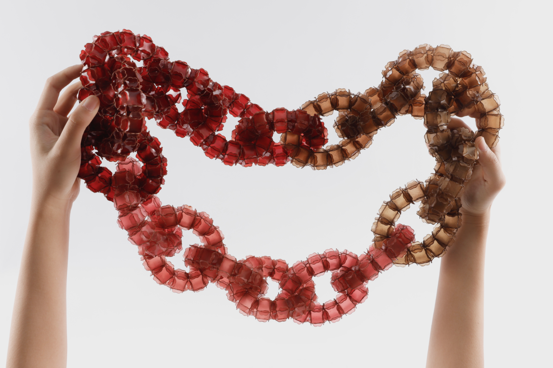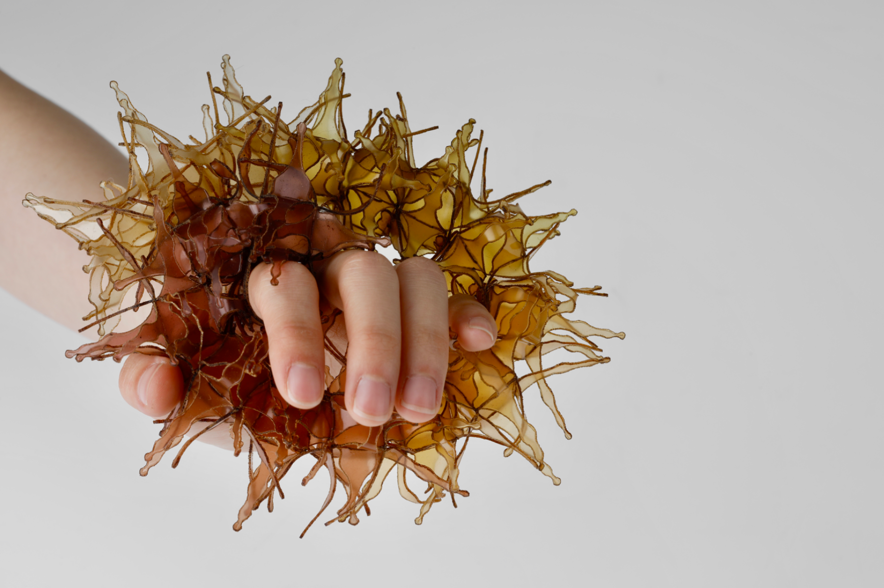 The project explores jewellery as a living extension of the marine cycle. Using fish scale bioplastic—a biodegradable material developed from discarded fish waste—I transform overlooked residue into poetic, wearable forms. Inspired by seaweed, plankton, and coral, the modular designs expand and flow across the body like organisms reclaiming space. Coloured with natural plant and fruit dyes, the pieces highlight the vibrancy and fragility of marine ecosystems. Designed to biodegrade, they invite reflection on impermanence and our relationship with adornment, offering an alternative narrative rooted in transformation, ecological responsibility, and the rhythms of the sea.