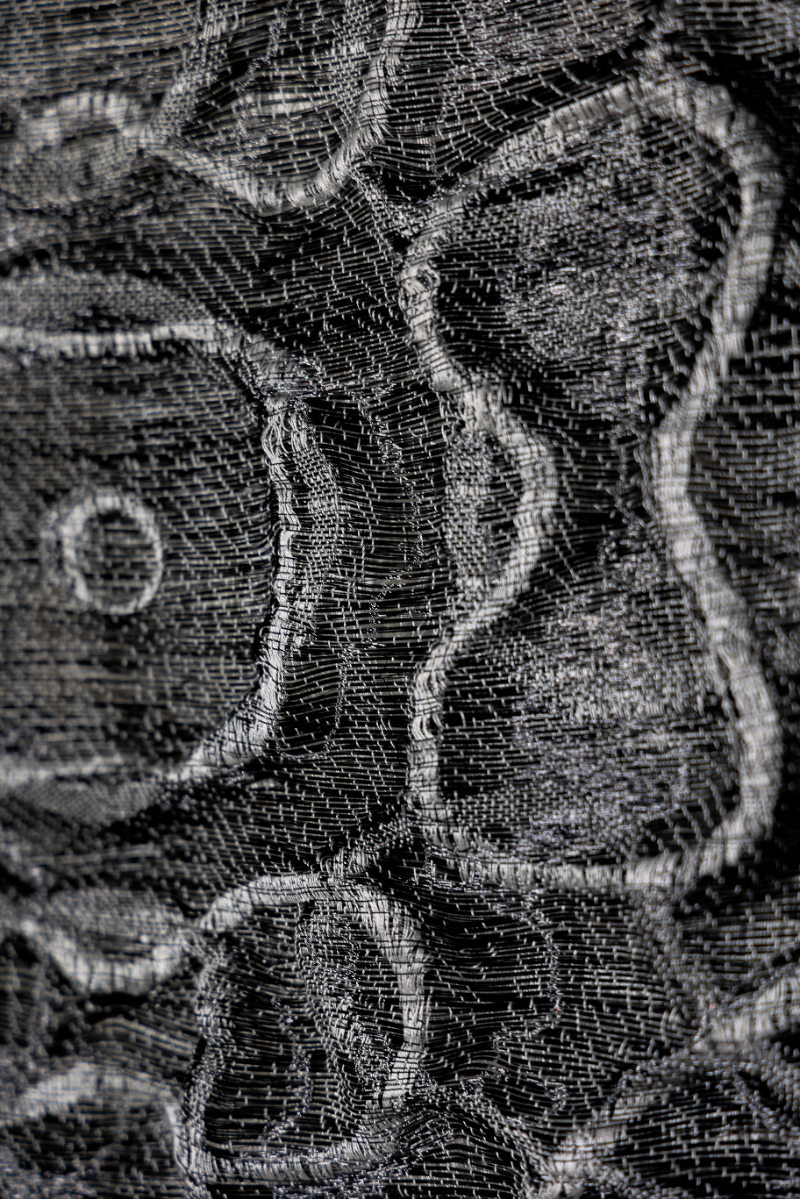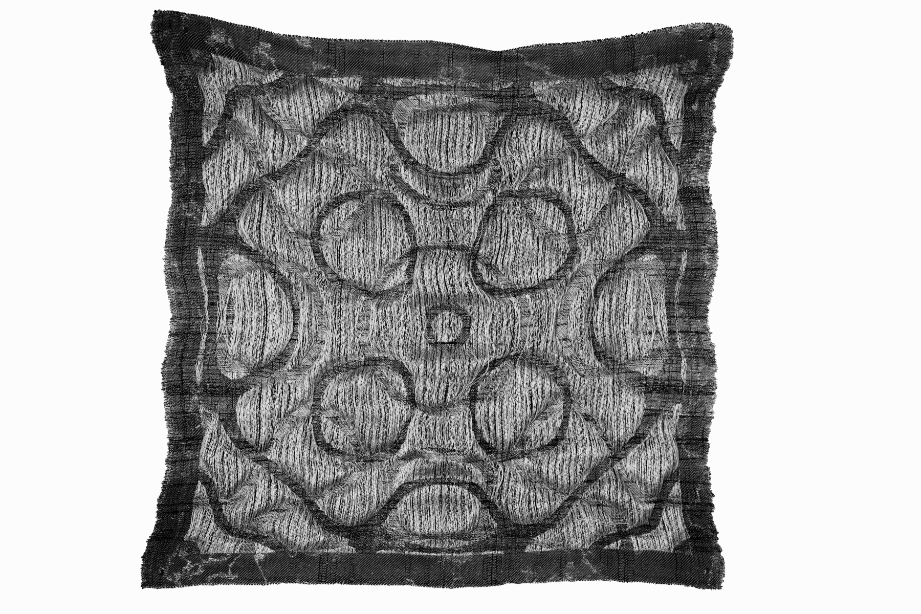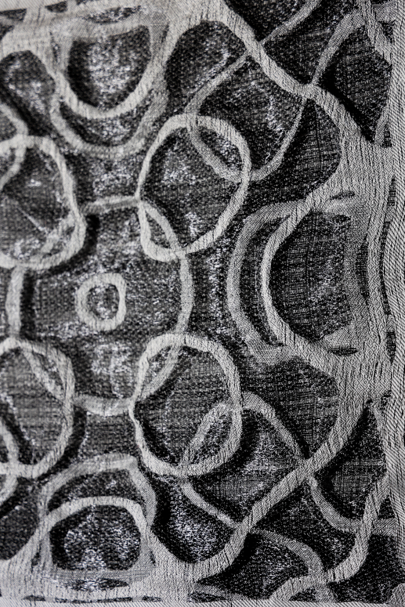 CONFLUENT PATTERNS investigates material translation of sound phenomena through textile structures, exploring how Chladni figures, acoustic wave patterns first documented by Ernst Chladni, can be reimagined through contemporary weaving. Operating at physics, digital manipulation, and material exploration, this three-phase methodology begins with digital transformation of original Chladni patterns, systematically layering multiple acoustic formations while preserving mathematical integrity. The TC2 jacquard loom serves as a technological interface between digital composition and material manifestation. Black copper wire combined with cotton weft creates visual contrast and material dialogue, metallic elements introducing conductivity referencing sound's electromagnetic properties. This work transforms transient, invisible sound vibrations into enduring material objects, challenging conventional temporal experiences. The resulting textiles function simultaneously as scientific documentation, artistic interpretation, and independent material explorations, offering new perspectives on experiencing sound's invisible architectures.