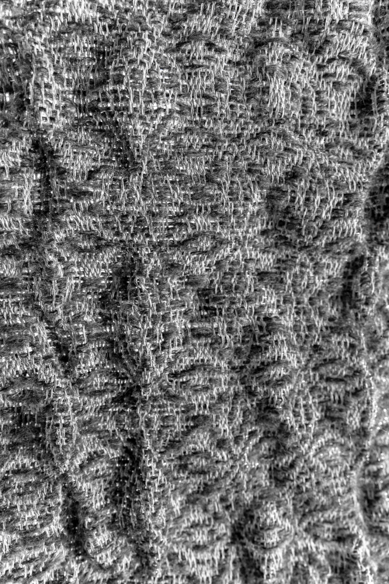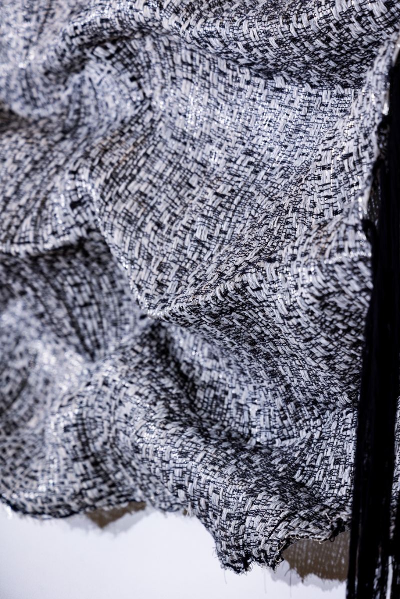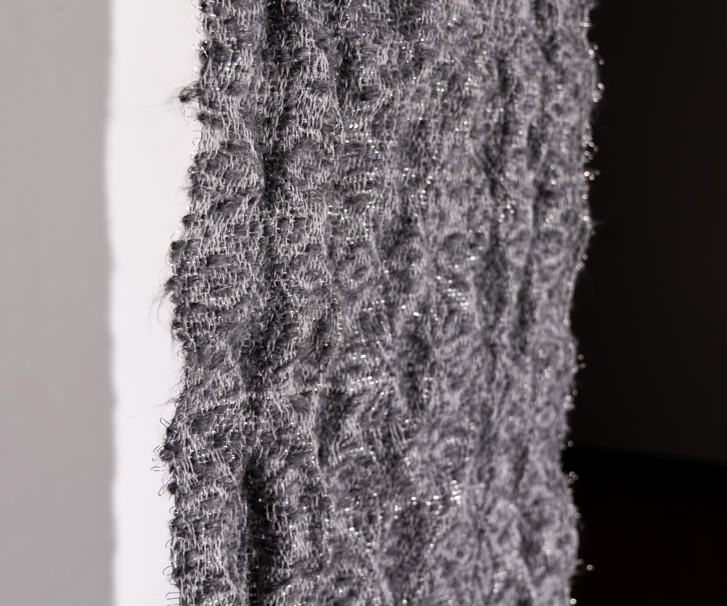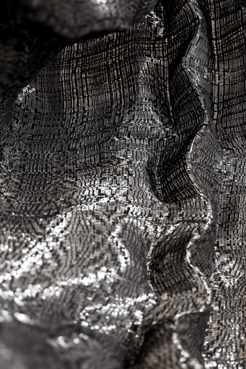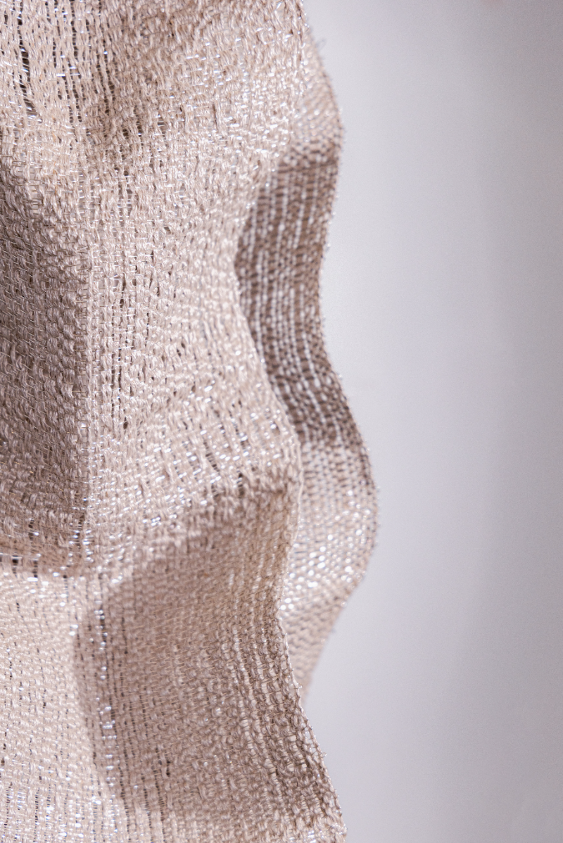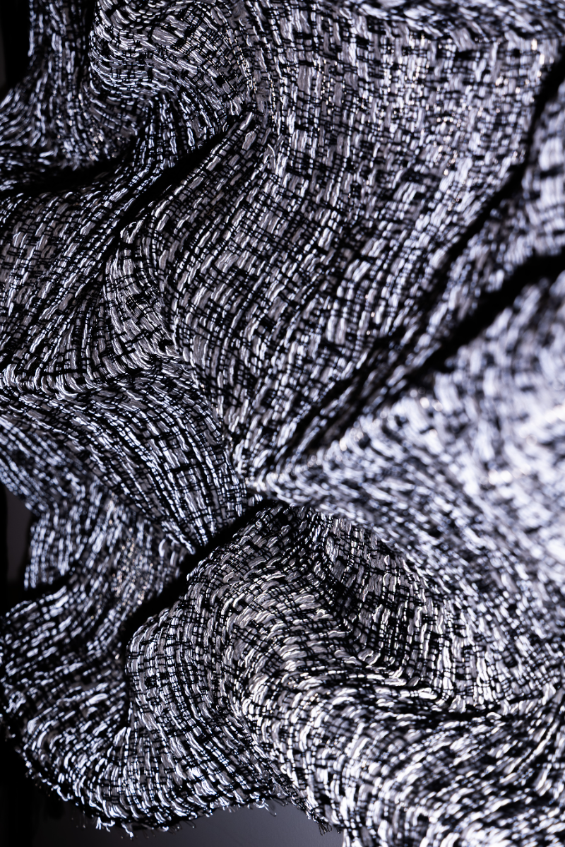 STRUCTURED TEXTILES delves into the intricate relationship between structural textiles and sonic phenomena. This collection examines the tangible manifestation of sound waves through layered fabrics, exploring their physical and visual complexities. The series features two complementary pieces that translate acoustic principles into textile form: HOMOPHONY presents a double-weave construction joined at one edge, employing the overshot technique to capture the fluid, rippling movement of single-melody sound progressions. through a diamond overshot weave. The synchronized layers mirror how dominant melodic lines are supported by harmonic accompaniment in musical composition. POLYPHONY expands this exploration through a three-layered woven structure that alternates between point twill and plain weave techniques. The outer layers, crafted with white copper thread, encase an inner fabric of black and white copper twisted together. This construction not only represents the complex interplay of independent melodic lines in polyphonic music but also engages with illumination, transforming The textile becomes a dynamic surface that responds to and manipulates light. Together, these pieces investigate the multisensory potential of woven structures, translating auditory concepts into tactile experiences that engage both touch and sight.