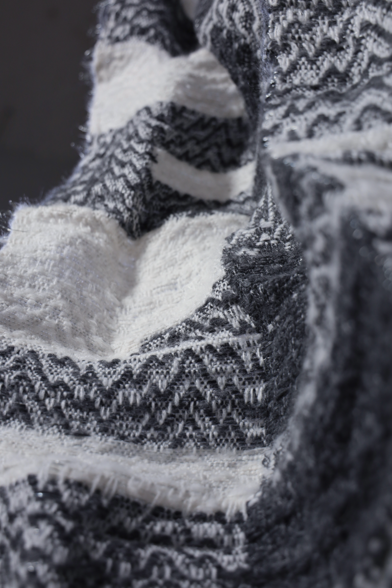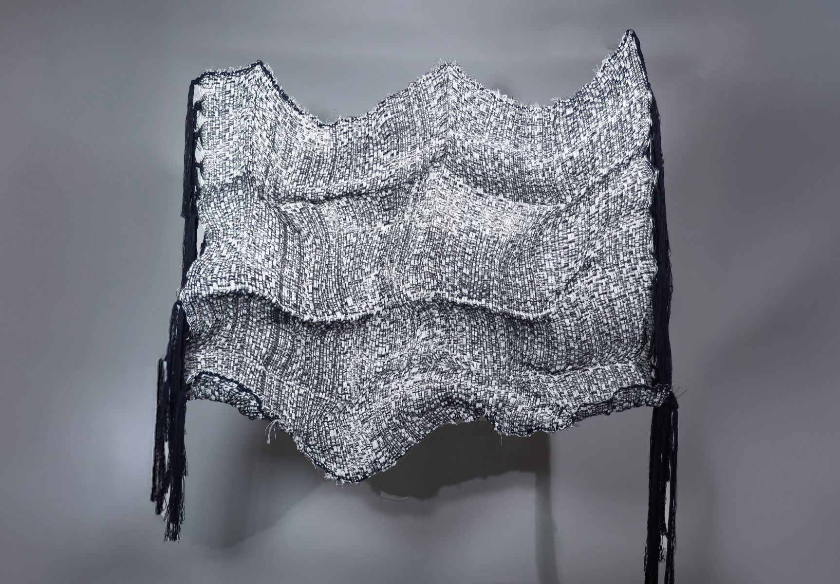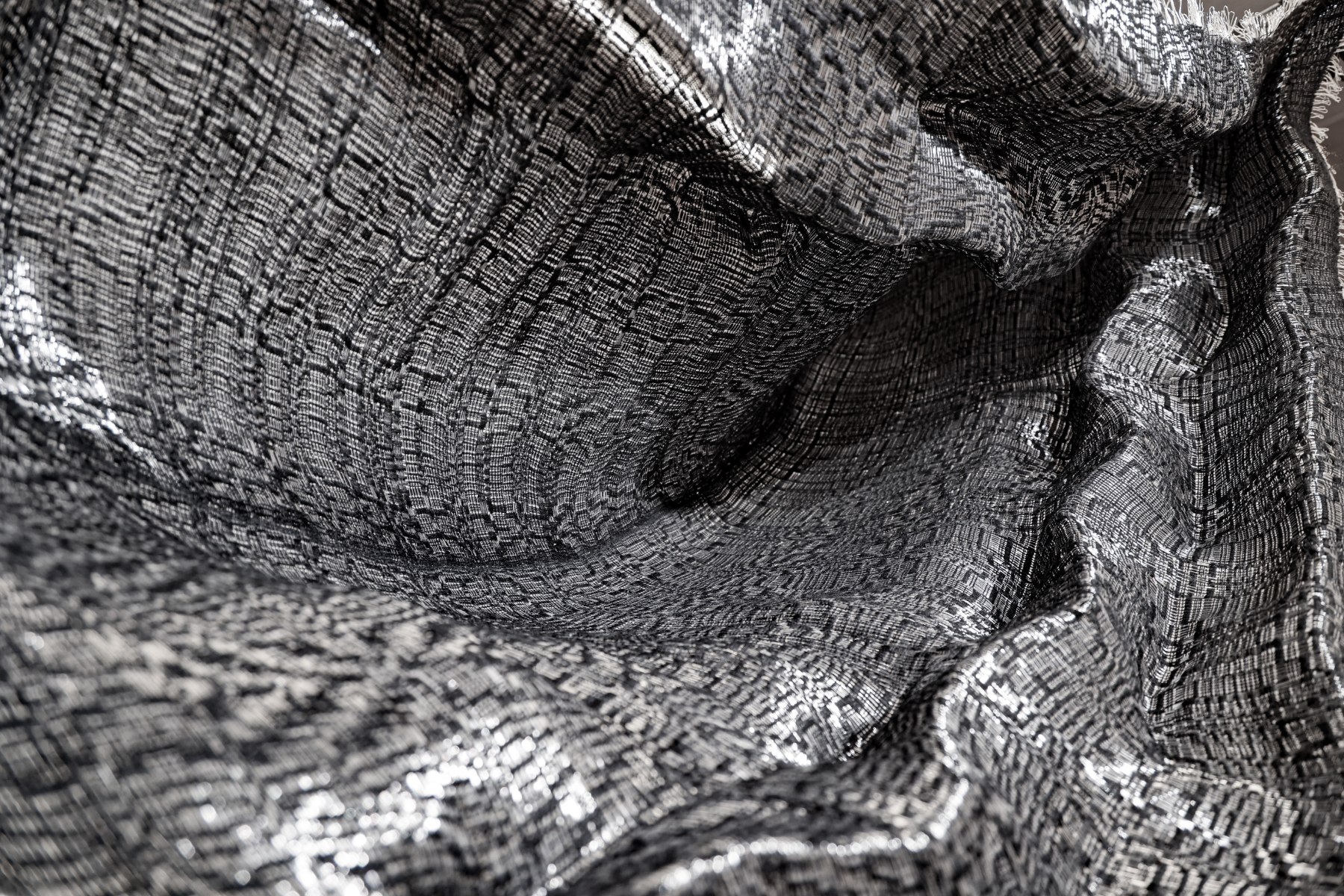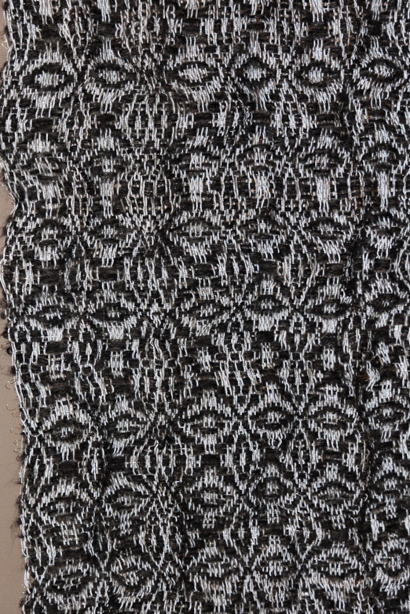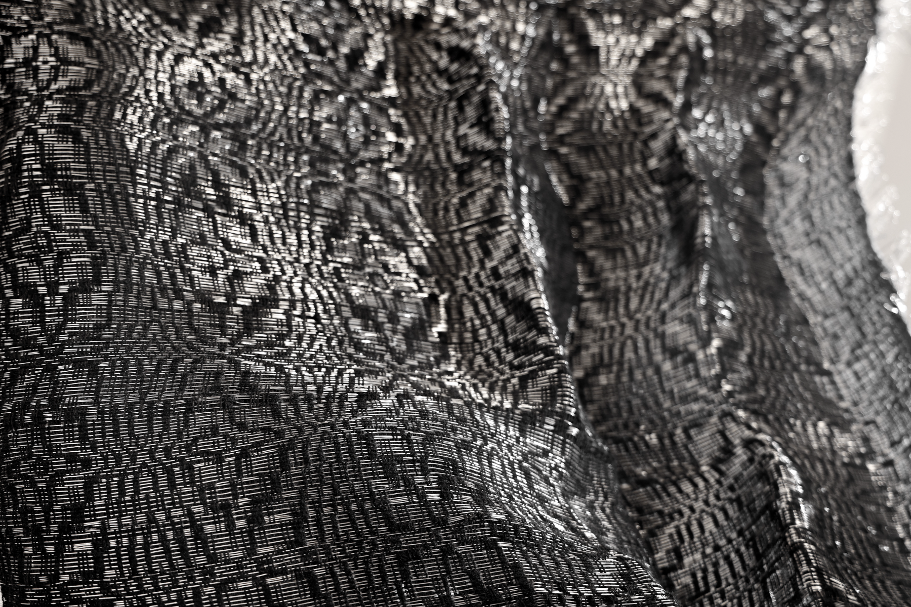 STRUCTURED TEXTILES delves into the intricate relationship between structural textiles and sonic phenomena. This collection examines the tangible manifestation of sound waves through layered fabrics, exploring their physical and visual complexities. The series features two complementary pieces that translate acoustic principles into textile form: HOMOPHONY presents a double-weave construction joined at one edge, employing the overshot technique to capture the fluid, rippling movement of single-melody sound progressions. through a diamond overshot weave. The synchronized layers mirror how dominant melodic lines are supported by harmonic accompaniment in musical composition. POLYPHONY expands this exploration through a three-layered woven structure that alternates between point twill and plain weave techniques. The outer layers, crafted with white copper thread, encase an inner fabric of black and white copper twisted together. This construction not only represents the complex interplay of independent melodic lines in polyphonic music but also engages with illumination, transforming The textile becomes a dynamic surface that responds to and manipulates light. Together, these pieces investigate the multisensory potential of woven structures, translating auditory concepts into tactile experiences that engage both touch and sight.