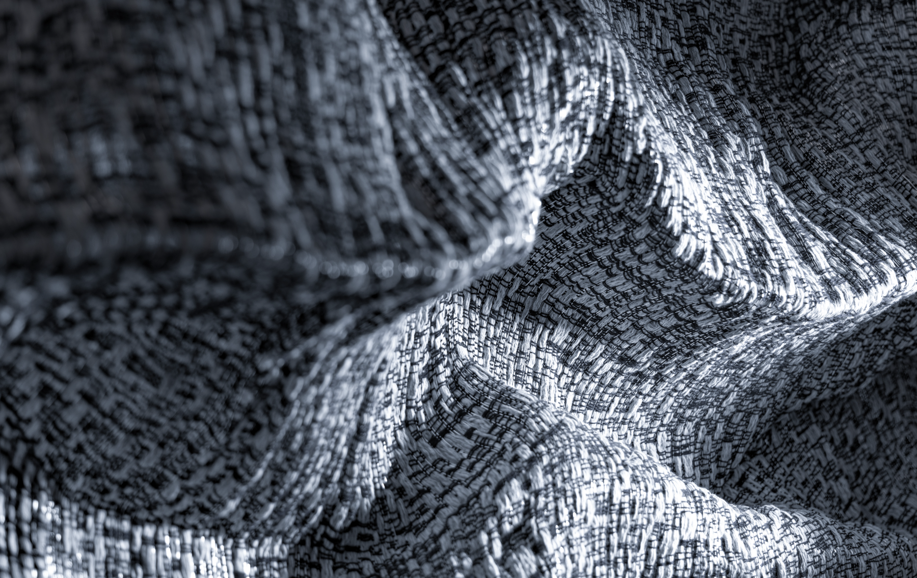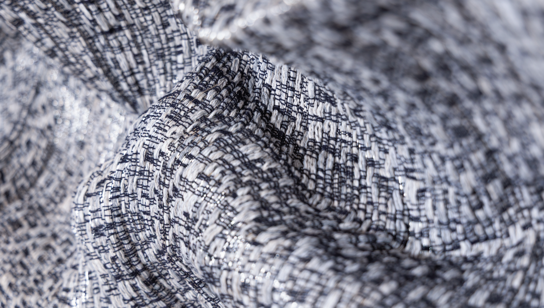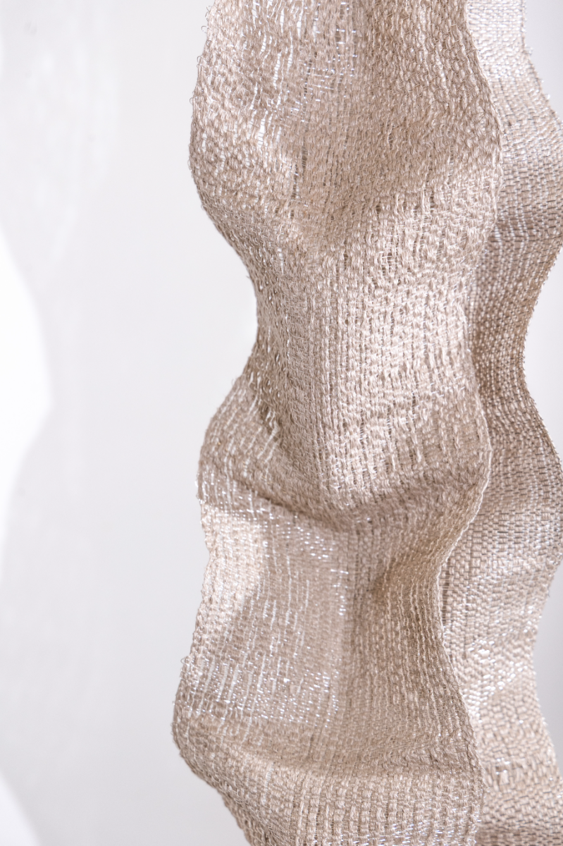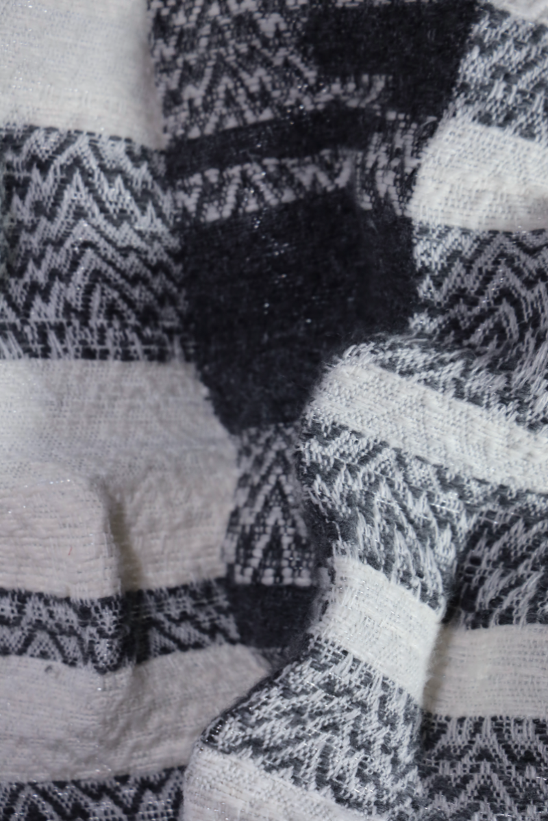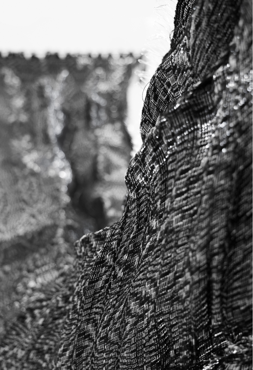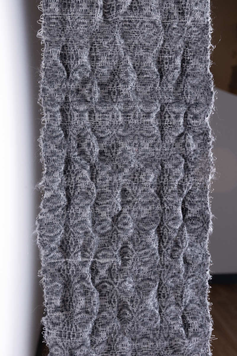 STRUCTURED TEXTILES delves into the intricate relationship between structural textiles and sonic phenomena. This collection examines the tangible manifestation of sound waves through layered fabrics, exploring their physical and visual complexities. The series features two complementary pieces that translate acoustic principles into textile form: HOMOPHONY presents a double-weave construction joined at one edge, employing the overshot technique to capture the fluid, rippling movement of single-melody sound progressions. through a diamond overshot weave. The synchronized layers mirror how dominant melodic lines are supported by harmonic accompaniment in musical composition. POLYPHONY expands this exploration through a three-layered woven structure that alternates between point twill and plain weave techniques. The outer layers, crafted with white copper thread, encase an inner fabric of black and white copper twisted together. This construction not only represents the complex interplay of independent melodic lines in polyphonic music but also engages with illumination, transforming The textile becomes a dynamic surface that responds to and manipulates light. Together, these pieces investigate the multisensory potential of woven structures, translating auditory concepts into tactile experiences that engage both touch and sight.
