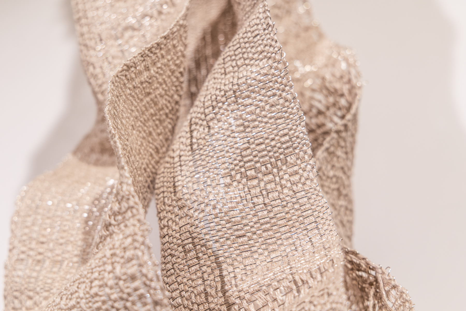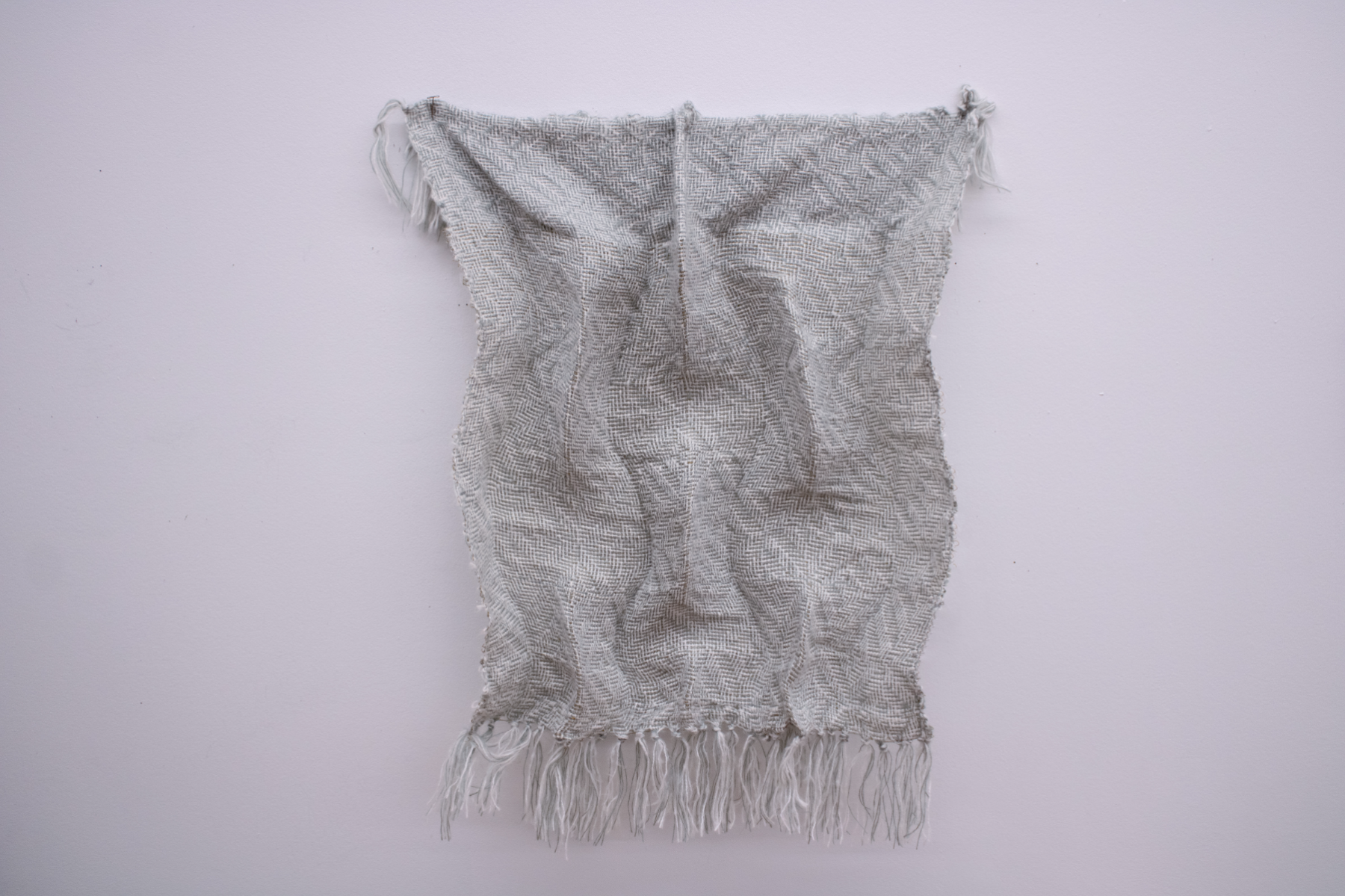 REFLECTION AND REFRACTION investigates the physical translation of wave phenomena into tactile textiles, transforming transverse and longitudinal patterns into structured fabrics that bridge fluid dynamics and solid form. Two complementary pieces capture different wave behaviors. TRANSVERSE explores wave interplay through sophisticated material composition, featuring a cotton warp with weft that combines twisted reflective threads, alpaca, recycled wool, and cotton, creating striking vertical lines. These elements interact dramatically with light, rendering invisible wave energy visible. RIPPLES employs reflective warp with diamond overshot technique, manifesting cross-sectional wave intersections. Geometric precision creates compelling interference pattern representations. Black mohair weft balances luminous reflective warp, providing contrast and depth. Both textiles are hand-molded into three-dimensional forms, enhancing wave-like qualities. These materials respond to light and become physical embodiments of natural phenomena, allowing tactile wave experience.