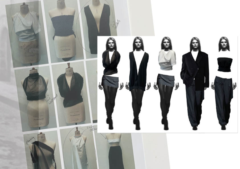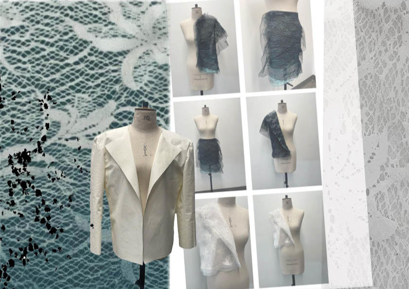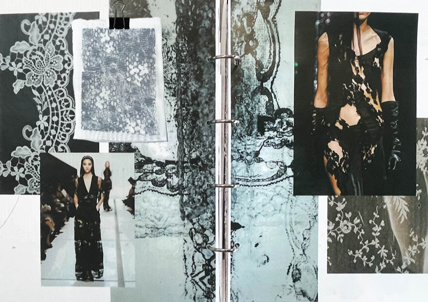 "Women's liberation is the liberation of the feminine in the man and the masculine in the woman" In this women’s wear collection, I explore the intersection of masculine and feminine stereotypes, creating a conversation that challenges traditional fashion norms. I draw on masculine elements like checks and pinstripes, symbolising strength and structure, whilst contrasting them with traditionally feminine motifs such as florals and lace, representing softness and delicacy. Through print techniques like Devore, flocking, and dyeing, I add texture and depth to the fabrics, enhancing the balance between these contrasting elements. The Devore technique, with its semi-sheer quality, creates a subtle tension between bold patterns and delicate textures, while flocking adds a tactile, luxurious feel, merging the masculine and feminine in unexpected ways. This collection is an exploration of duality—where rigid, tailored patterns meet fluid, intricate designs. It reimagines the idea of femininity, moving beyond societal expectations to embrace a more complex and layered identity. By blending these contrasting ideas, I aim to create garments that empower the wearer to express their individuality and navigate between masculine and feminine realms with confidence. Ultimately, the collection celebrates the freedom of self-expression, allowing for a more inclusive, fluid understanding of femininity—one that doesn’t adhere to stereotypes but rather embraces the full spectrum of what it can be.